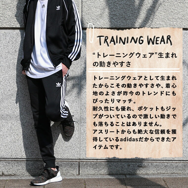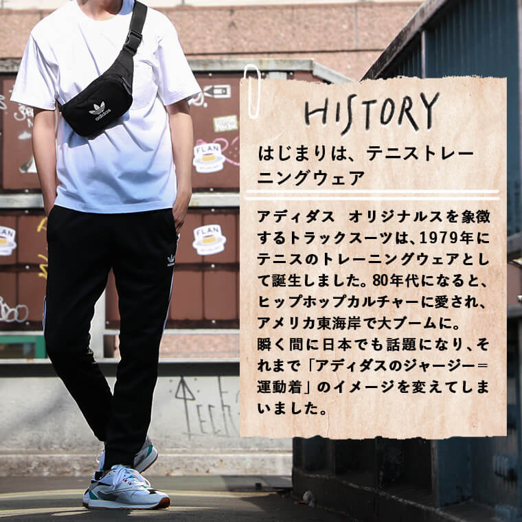 現代風にアレンジされたアディダスの名作パンツ スーパースターシューズを着想源に、SSTトラックパンツはテニスのトレーニング向けアイテムとして、1979年に誕生。
